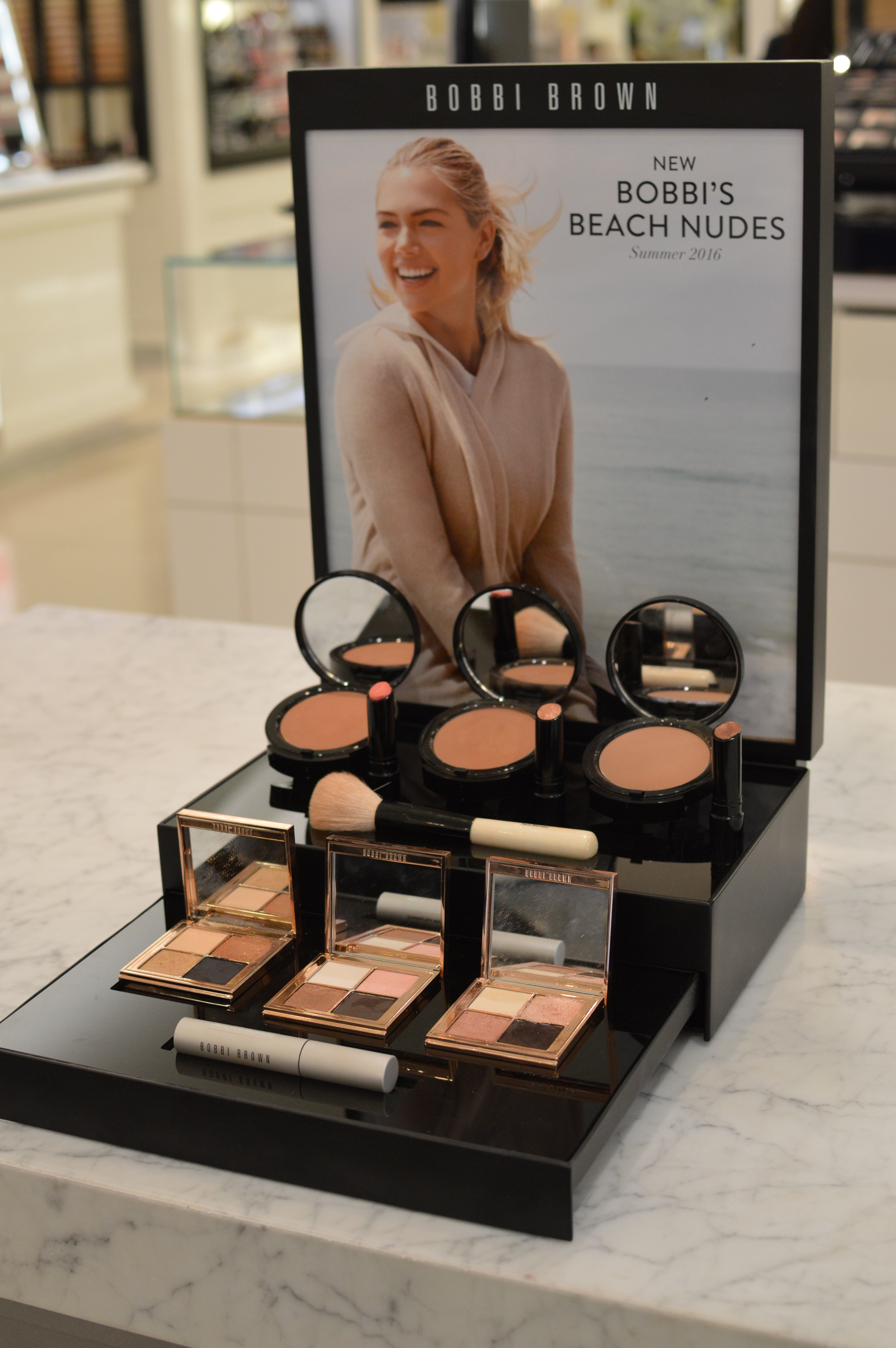 My nails were done by 7pm, which meant it was time for my appointment at Bobbi Brown. When I got there I saw I was sharing the session with Suzy from Suzy Hearts Beauty. I’ve followed Suzy on Instagram and Twitter for a while so it was lovely to put a face to the name! At the Bobbi Brown counter, artist Kate was showing us how to create the perfect Summer look using the new ‘Beach Nudes’ collection, inspired by the perfect sun-kissed glow. I was instantly drawn to the eye palettes. In the collection there are three eye palettes to choose from, 3 new summer lip shades and also bronzing powders. Find out more about the collection by clicking here.