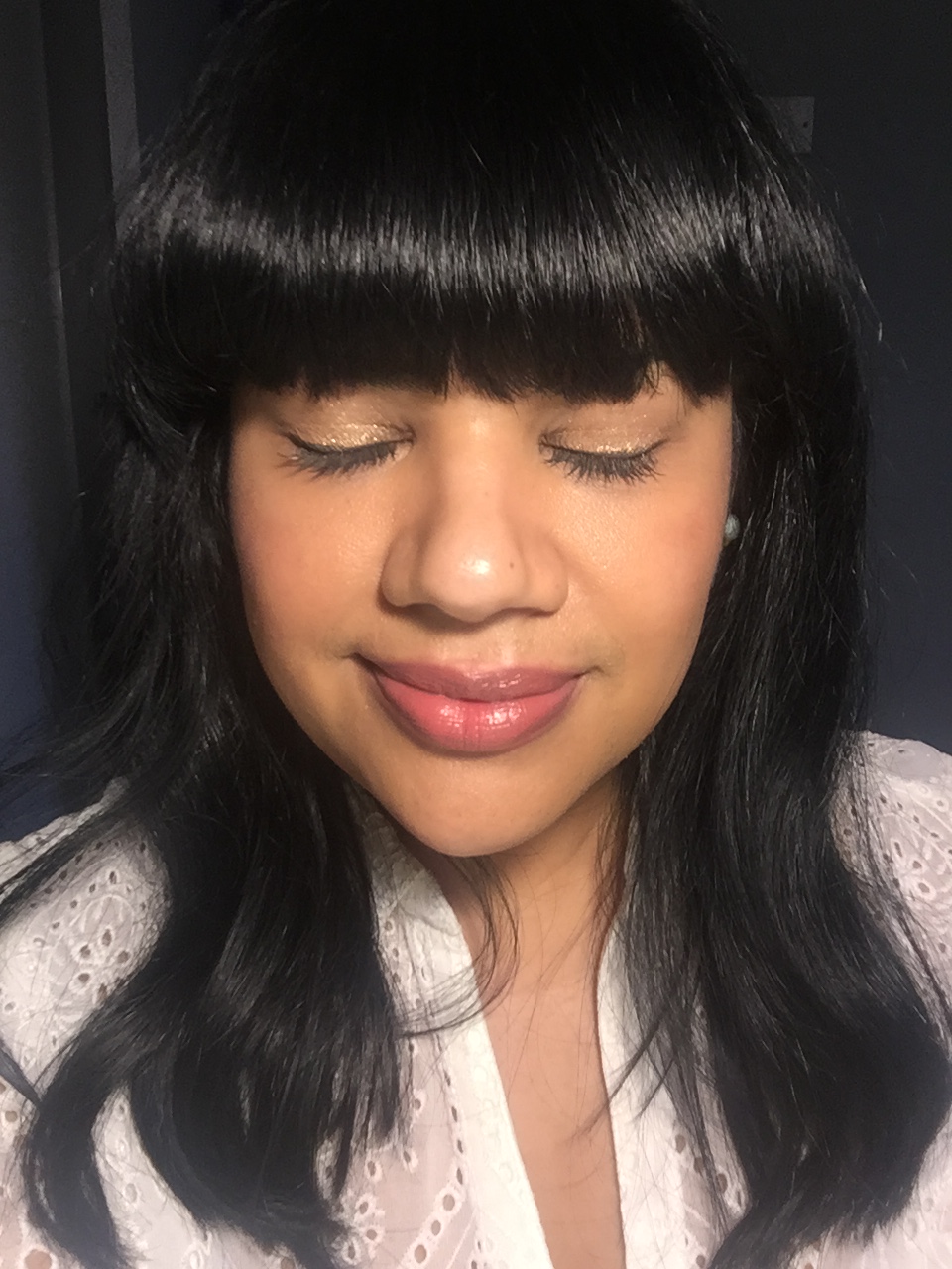 In terms of the eye palette, I love the shimmer and light gold colour swept along my lids. (I took the photos below at about 9pm, my base had been applied at 7.30am that morning and I touched up my blusher before heading to the event!)